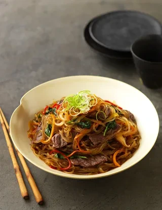 - 재료: 당면 200g, 소고기 150g, 표고버섯 4개, 양파 1개, 당근 1개, 시금치 한 줌
