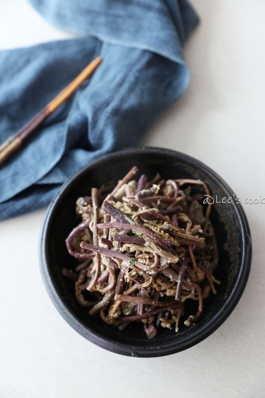 - 불린 고사리를 끓는 물에 데친 뒤 먹기 좋은 크기로 자르기