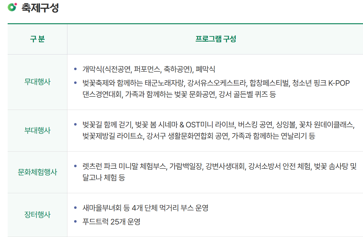 행사 기간 동안 강서 골든벨, 가족과 함께하는 벚꽃 문화공연, 청소년 핑크 K-POP 댄스, 버스킹 공연, OST 미니 라이브 등이 진행되는 공연 프로그램이 포함되어 있다.